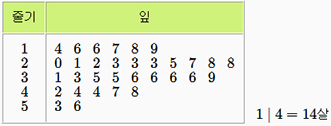 어떤 휴대 전화 가게에서는 어느 날 구매 고객의 연령을 조사하여 아래와 같이 줄기와 잎 그림으로 나타내었다. 다음에 답하여라.